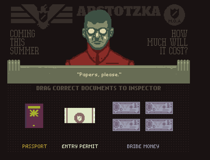 Papers, Please by Lucas Pope, photo above, where you act as an immigration inspector. For Mac or PC.