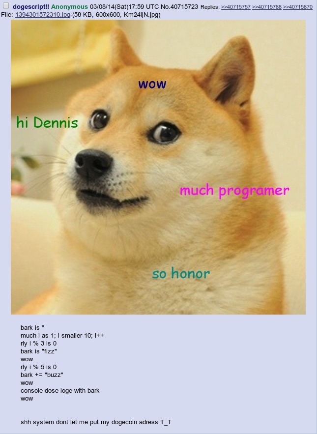 0 March 8, 2014December 10, 2018 Written by Taku sodogemuchwow: fizzbuzz on dogescript! by DEeesrmimwKoTtQEDymyrtFJsHKHTXMUDP Share this: Click to share on X (Opens in new window) X Click to share on Facebook (Opens in new window) Facebook Like Loading... Related